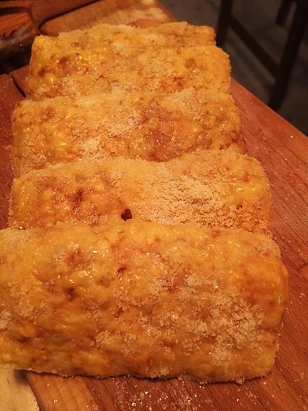 我個人覺得還好很像一整塊乾起司 上面灑糖粉